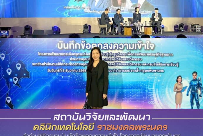 คลินิกเทคโนโลยีมหาวิทยาลัยเทคโนโลยีราชมงคลพระนคร เข้าร่วมพิธีลงนามบันทึกข้อตกลงความเข้าใจ โครงการพัฒนายกระดับครูกรมส่งเสริมการเรียนรู้ สู่ครูนวัตกรเพื่อการพัฒนาเศรษฐกิจฐานรากด้วยการอุดมศึกษา วิทยาศาสตร์ วิจัยและนวัตกรรม จัดขึ้น ในวันที่ 8 ธันวาคม 2568 เวลา 10.00-15.30 น. ณ ห้องอินฟินิตี้ บอลรูม โรงแรมพูลแมน คิง เพาเวอร์ รางน้ำ กรุงเทพมหานคร Continue Reading →