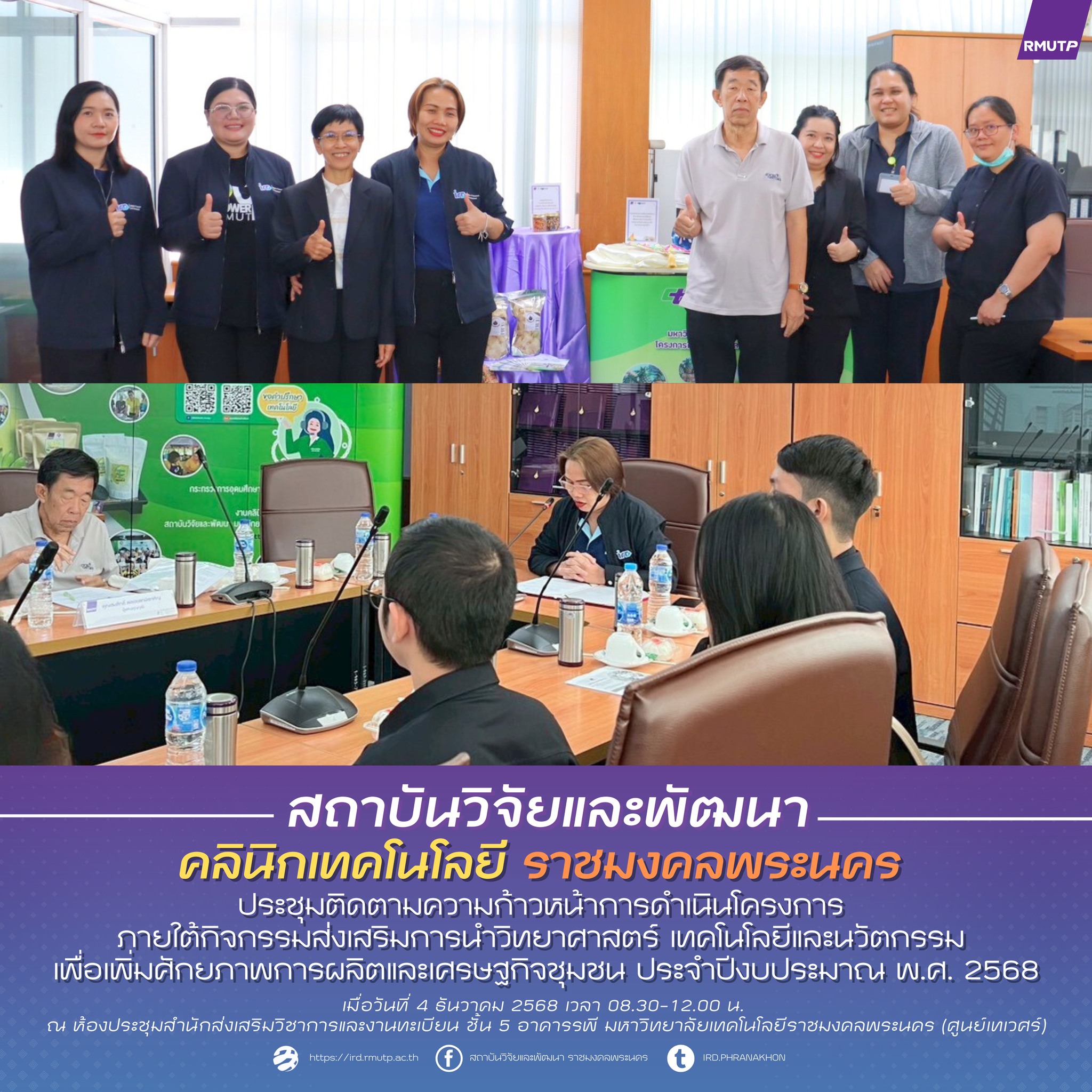 คลินิกเทคโนโลยี มทร.พระนคร ประชุมติดตามความก้าวหน้าการดำเนินโครงการ ภายใต้กิจกรรมส่งเสริมการนำวิทยาศาสตร์ เทคโนโลยีและนวัตกรรม เพื่อเพิ่มศักยภาพการผลิตและเศรษฐกิจชุมชน ประจำปีงบประมาณ พ.ศ. 2568จัดขึ้น ในวันที่ 4 ธันวาคม 2568 เวลา 08.30-12.00 น. ณ ห้องประชุมสำนักส่งเสริมวิชาการและงานทะเบียน ชั้น 5 อาคารรพี มหาวิทยาลัยเทคโนโลยีราชมงคลพระนคร (ศูนย์เทเวศร์)
