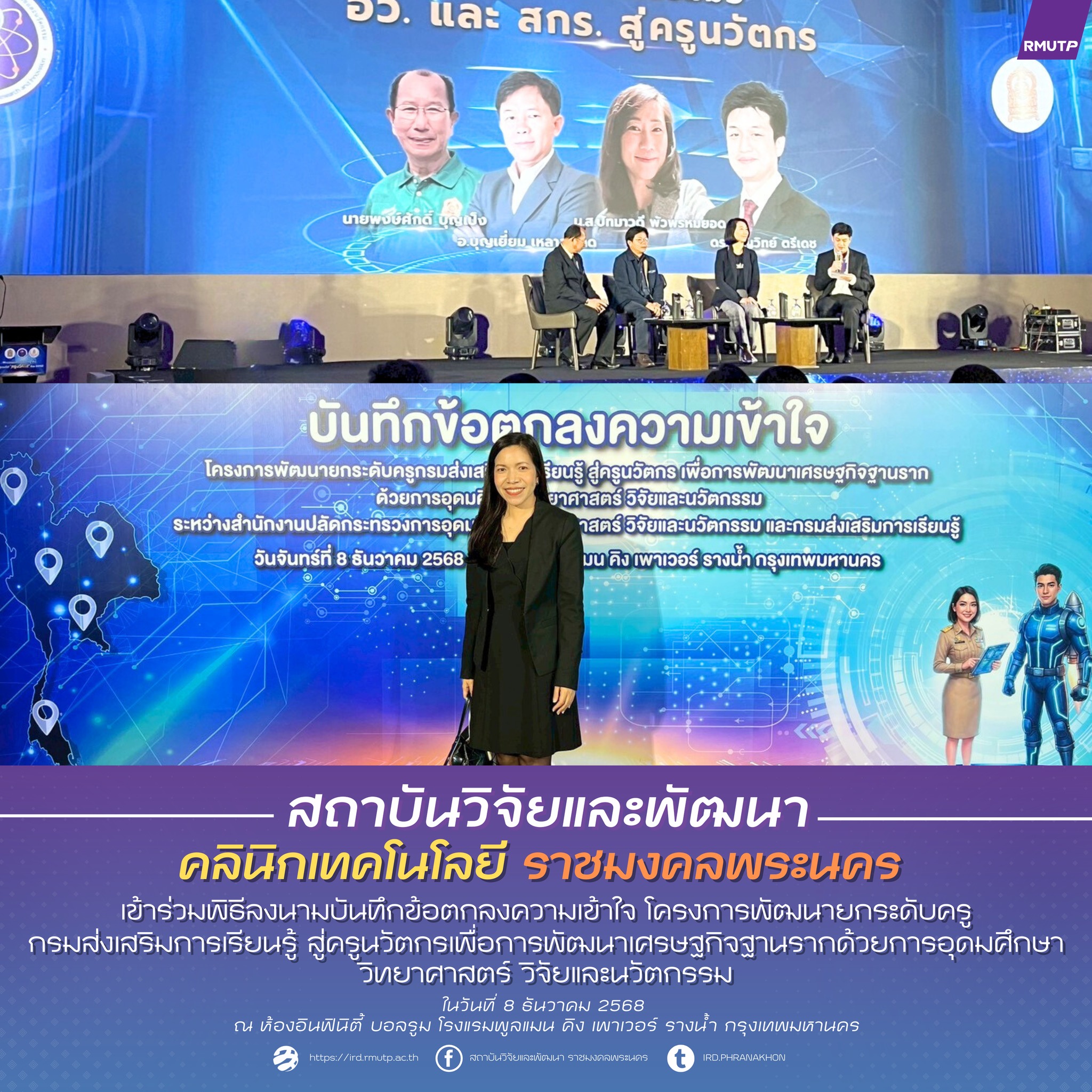 คลินิกเทคโนโลยีมหาวิทยาลัยเทคโนโลยีราชมงคลพระนคร เข้าร่วมพิธีลงนามบันทึกข้อตกลงความเข้าใจ โครงการพัฒนายกระดับครูกรมส่งเสริมการเรียนรู้ สู่ครูนวัตกรเพื่อการพัฒนาเศรษฐกิจฐานรากด้วยการอุดมศึกษา วิทยาศาสตร์ วิจัยและนวัตกรรม จัดขึ้น ในวันที่ 8 ธันวาคม 2568 เวลา 10.00-15.30 น. ณ ห้องอินฟินิตี้ บอลรูม โรงแรมพูลแมน คิง เพาเวอร์ รางน้ำ กรุงเทพมหานคร